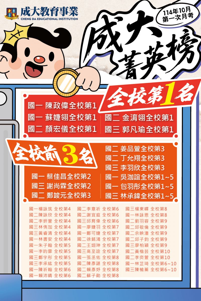 全校前10名都來自成大